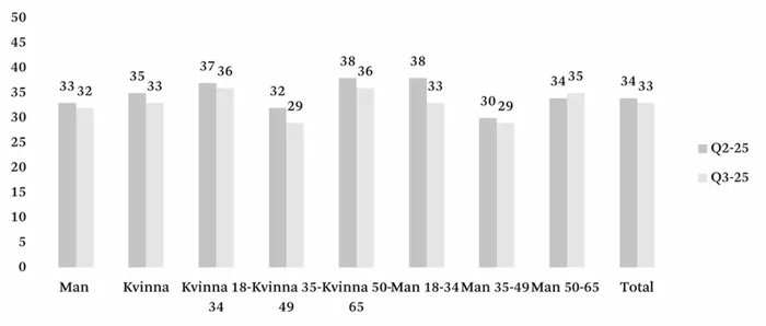 ANSTÄLLNINGSINDIKATORN, PER ÅLDER OCH KÖN, Q3 2025 JÄMFÖRT MED Q2 2025: